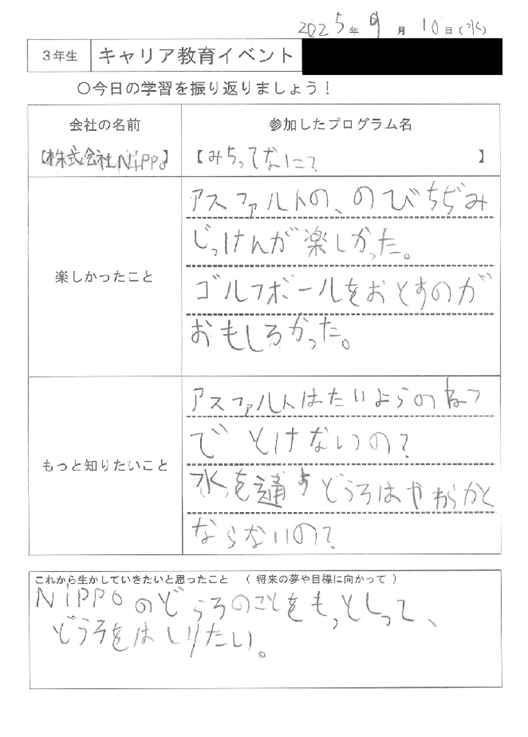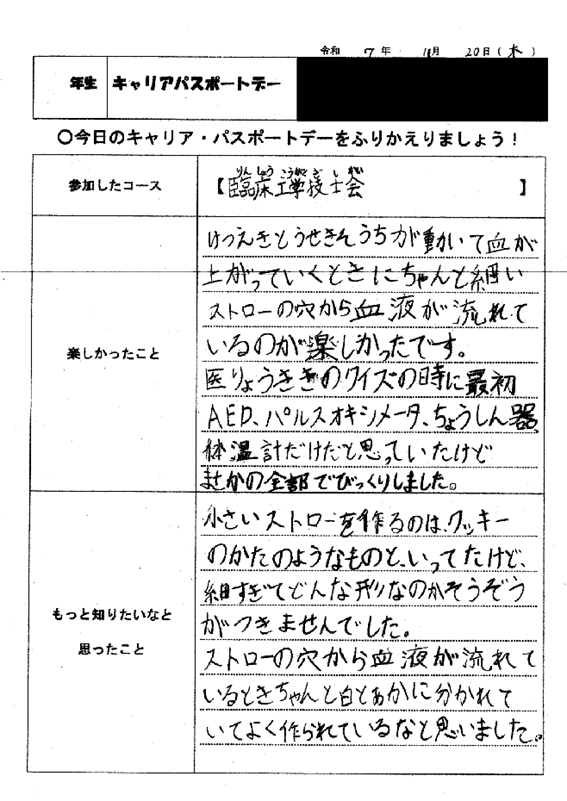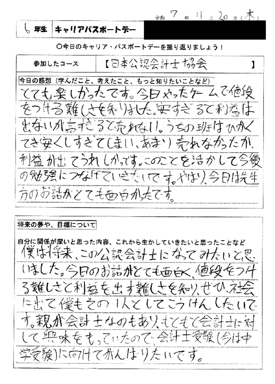また、子どもたちは普段の学校生活では見たり聞いたりすることが難しい貴重な体験を通して、自分の将来にどのように役立てるかを熱心に考えました。